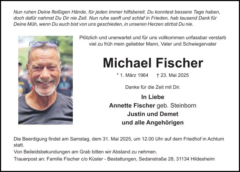 wir wünschen Ihnen von Herzen viel Kraft, dass Sie Menschen um sich haben, die Ihnen in dieser schweren Zeit beistehen und Halt geben. Zusätzlich können Sie auf dieser Gedenkseite Erinnerungen teilen und so das Andenken gemeinsam wachhalten.